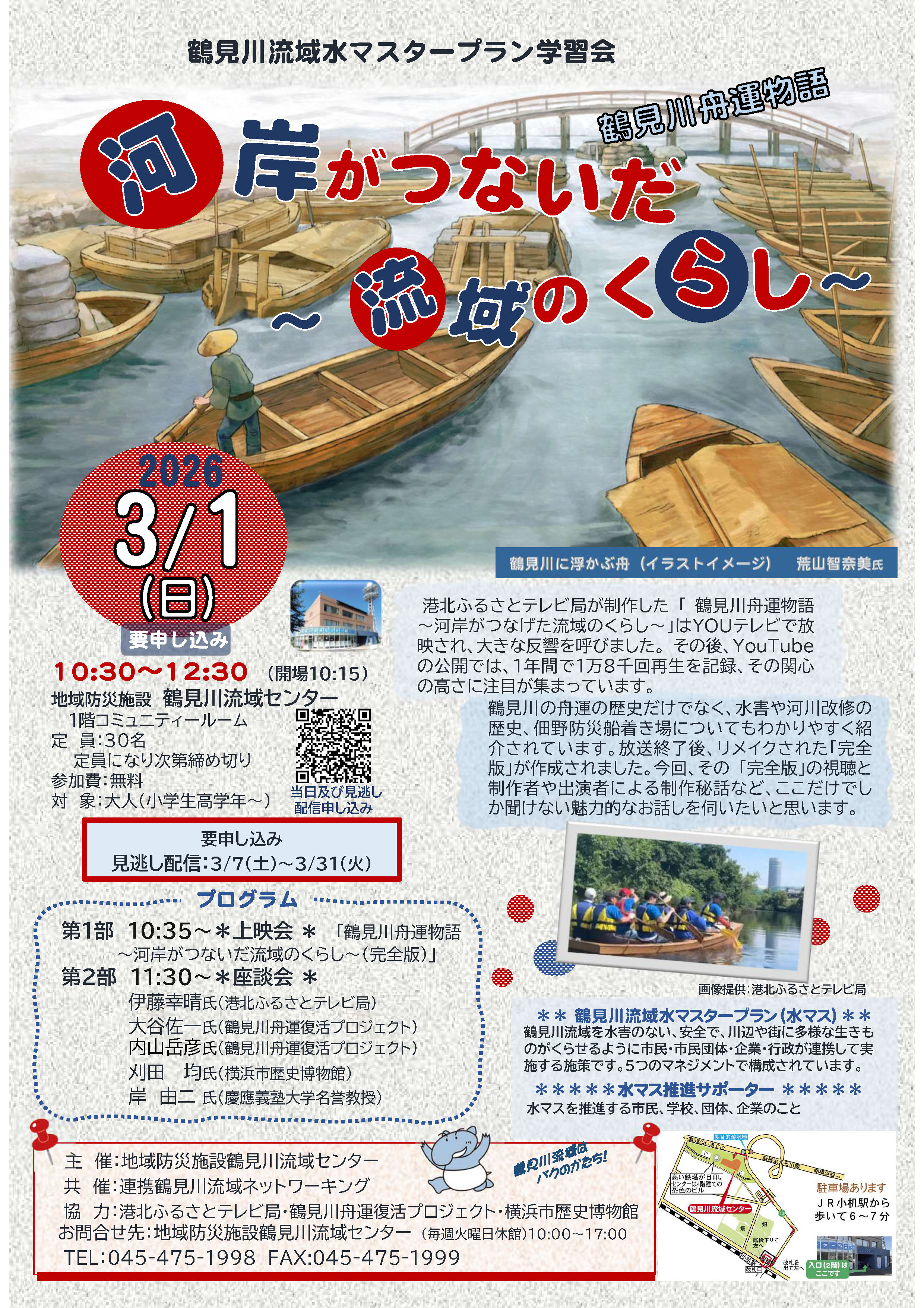 地域防災施設 鶴見川流域センターでは3月1日(日)に表記のイベントを開催します。>内容は案内チラシを御覧ください。 PDFを表示できない方はこちら(jpg高精細画像) お申し込みはこちら